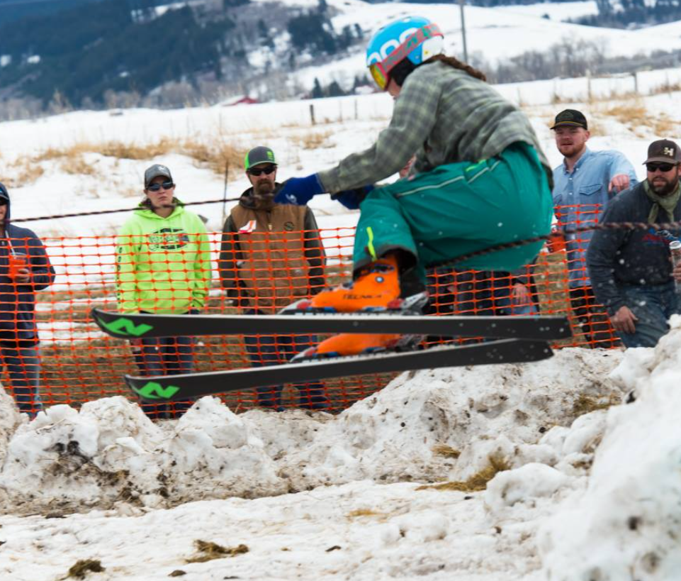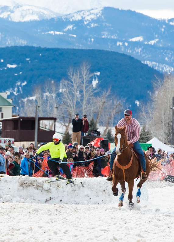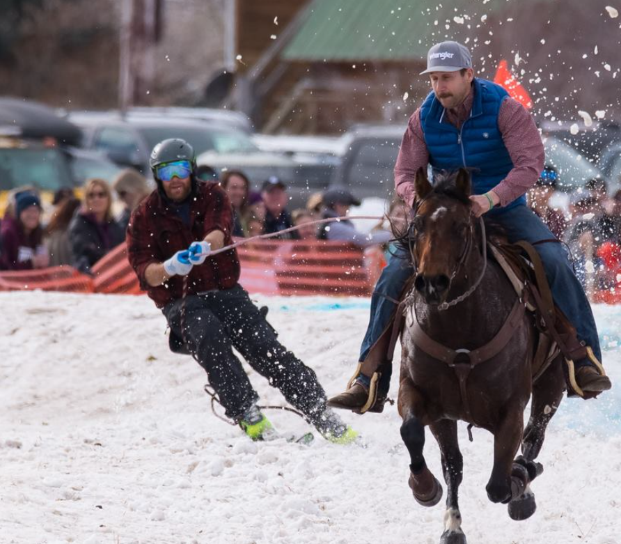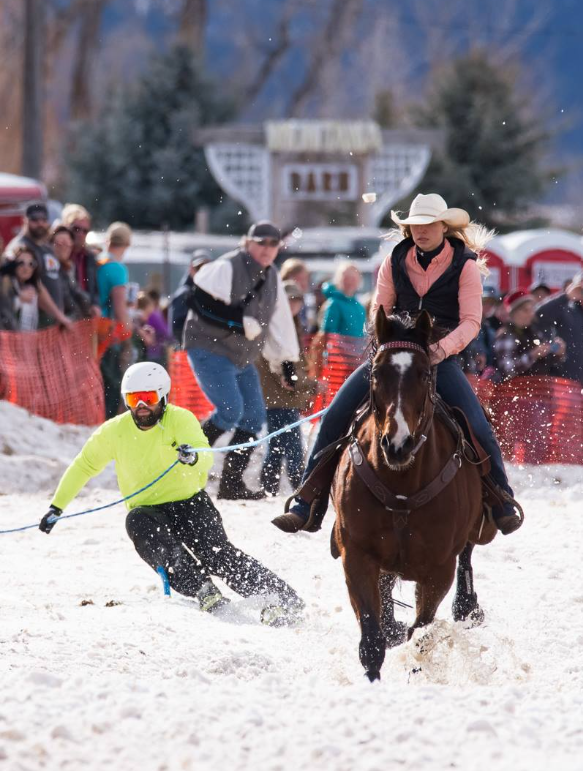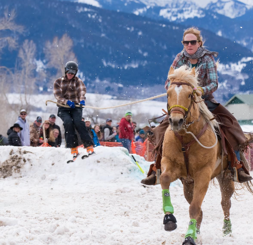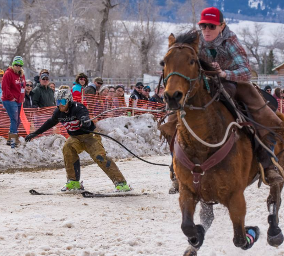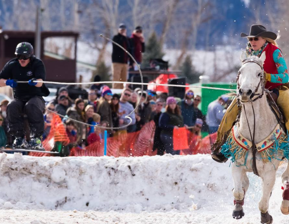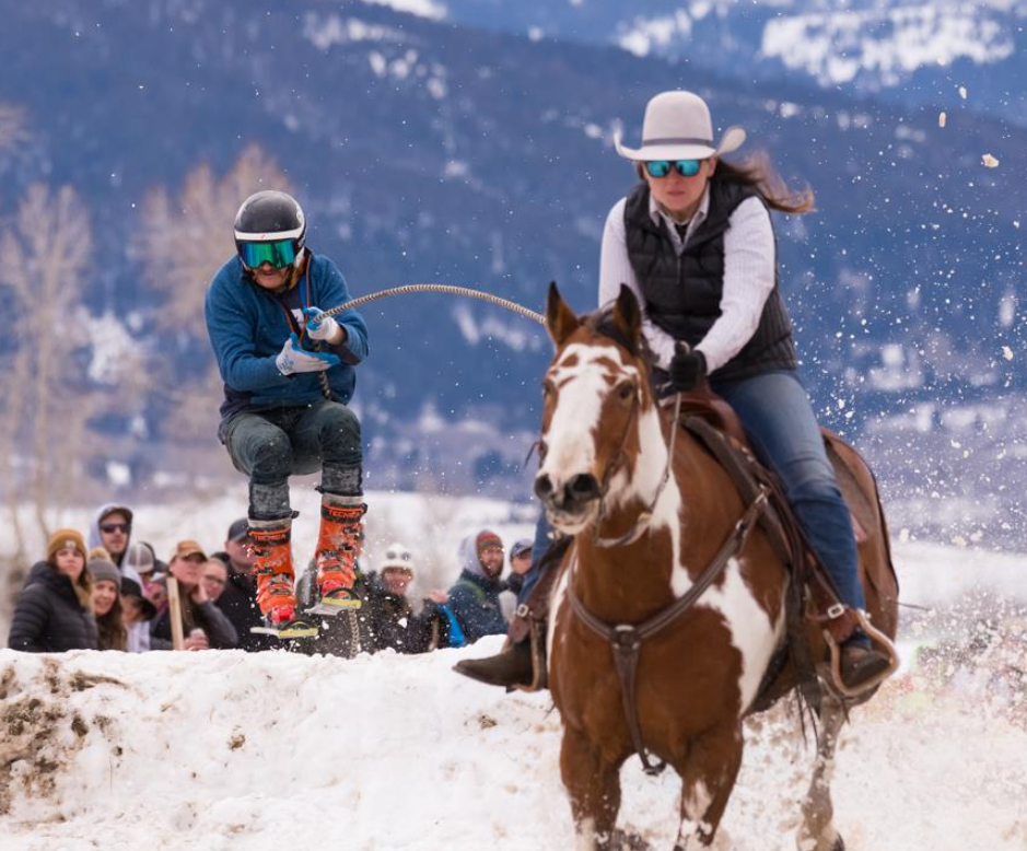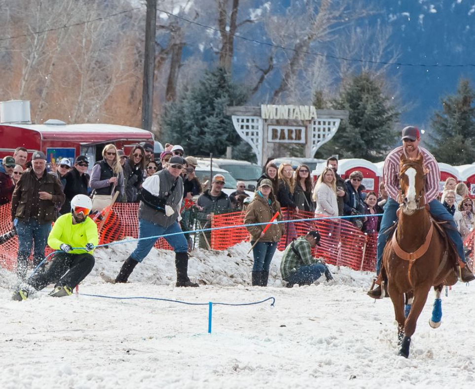 Skijoring: horse, cowboy, skier, and rope combined for an adrenaline snow race in the Gallatin Valley.
