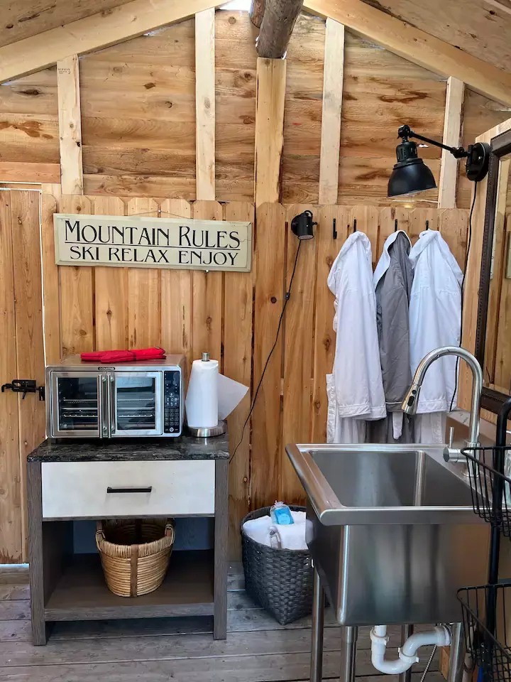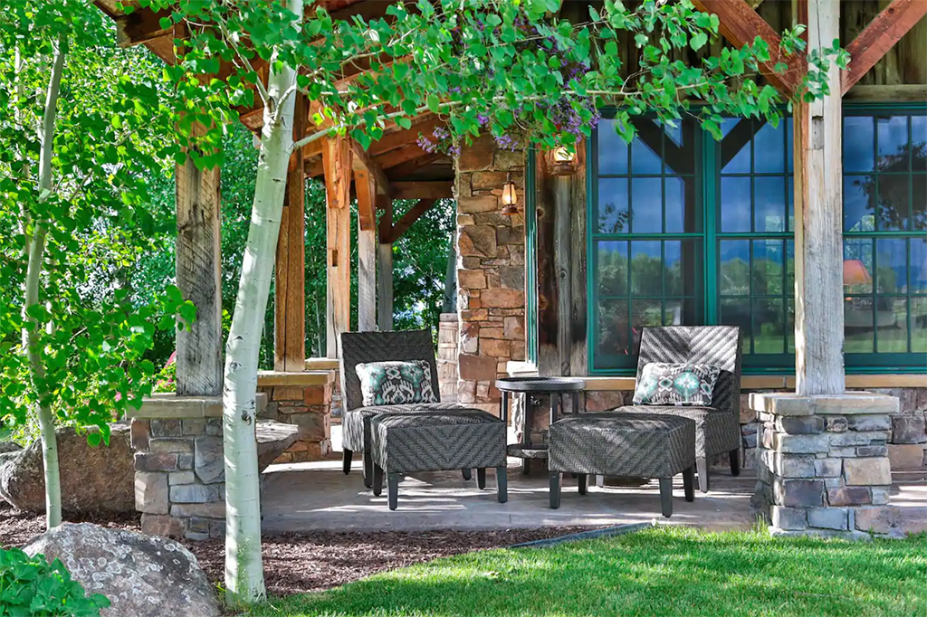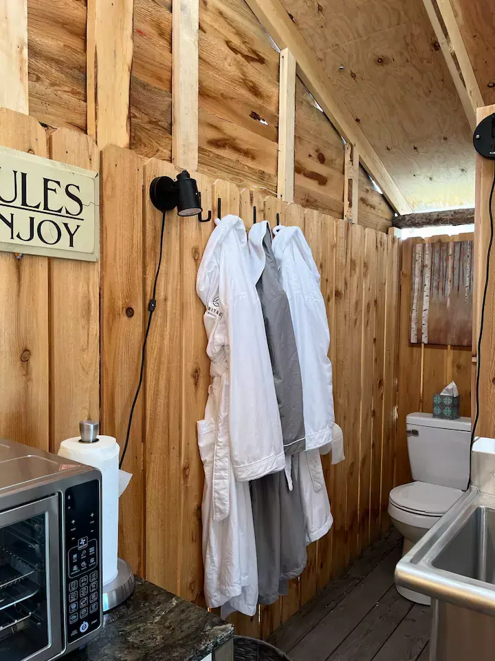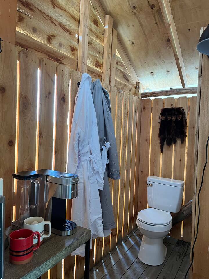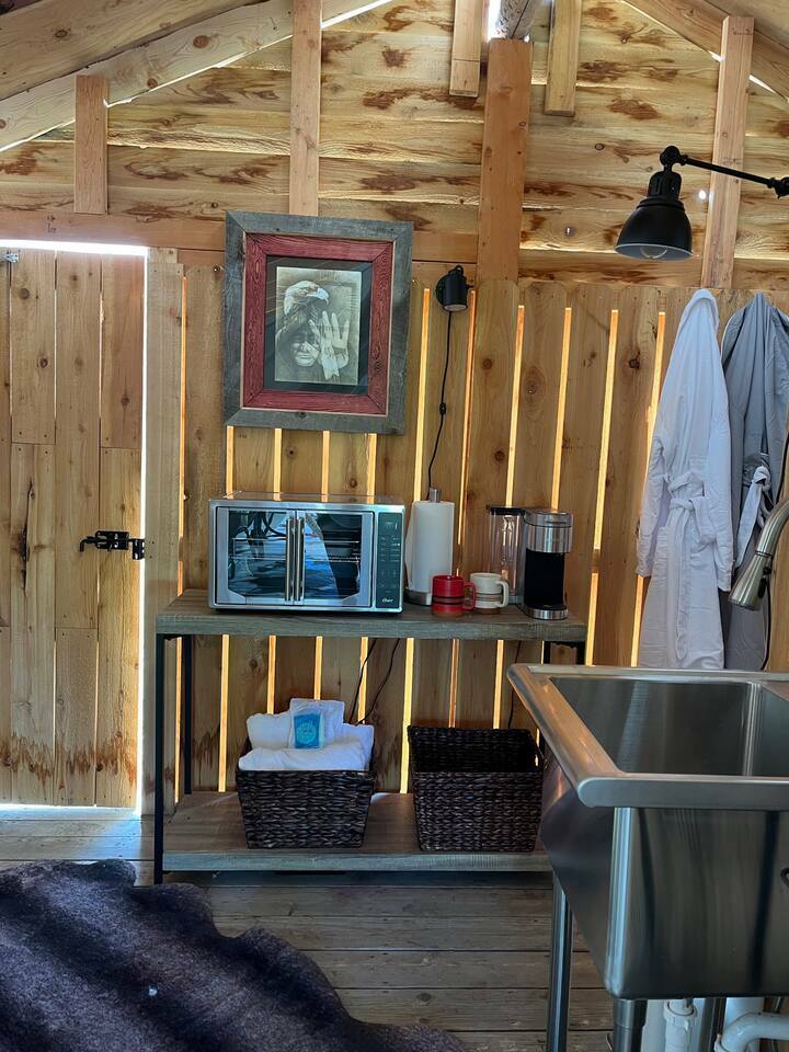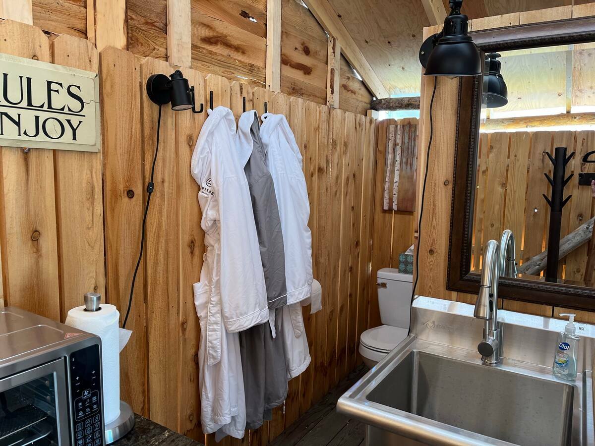 Other amenities: coffee, convection oven, air fryer, toaster, glasses, dishes, wine opener, rocking chairs on the porch, special toiletries, Heritage Ranch robes, down comforters