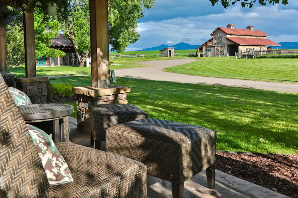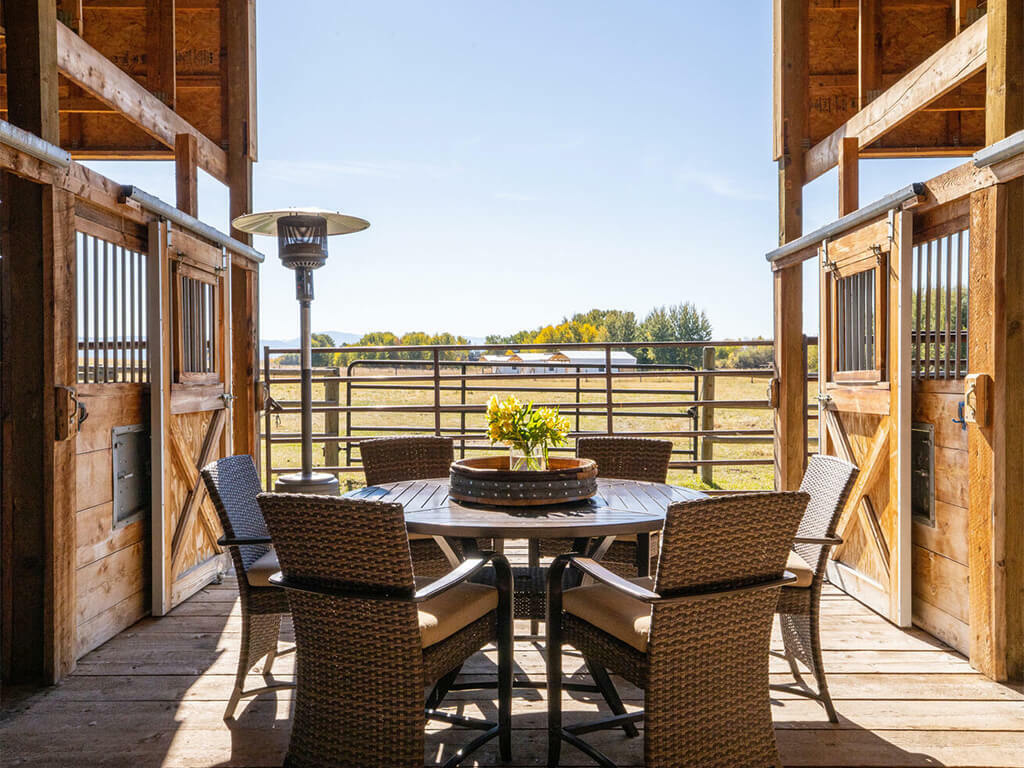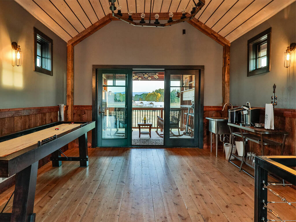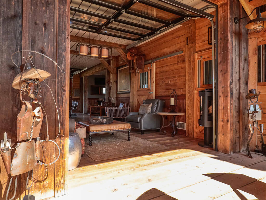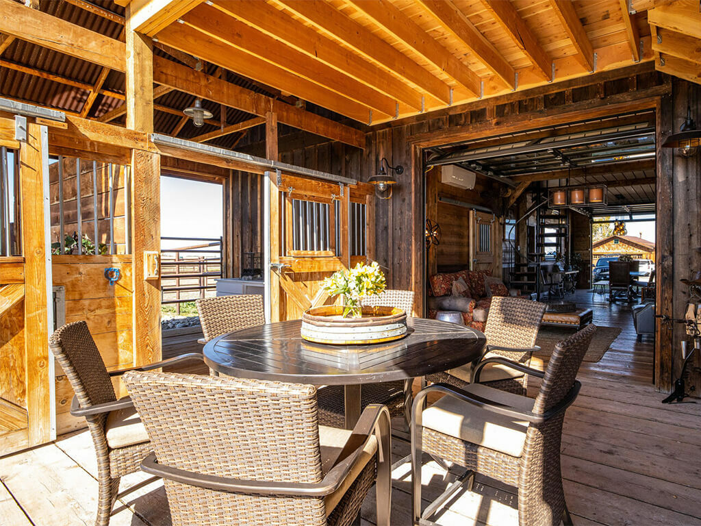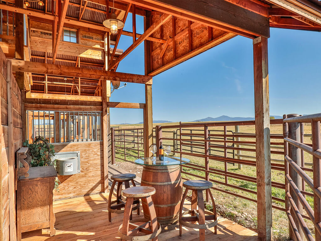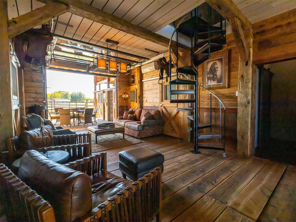 When you walk through the barn doors, you feel like you’ve stepped into the luxurious/adventurous west. Paintings and prints of local artists adorn the space, while a spiral staircase to the upper level takes you to the supple leather chairs, Direct TV, and a shuffleboard for entertainment. The allure of the modern west at our luxury barn is located just 10 minutes from Bozeman, MT. We added second level exterior seating space to the south just outside and under the back porch of the barn. Protected from the elements while experiencing the Montana outdoors, this space is where you touch life while embracing the comfort and security of the surroundings!
