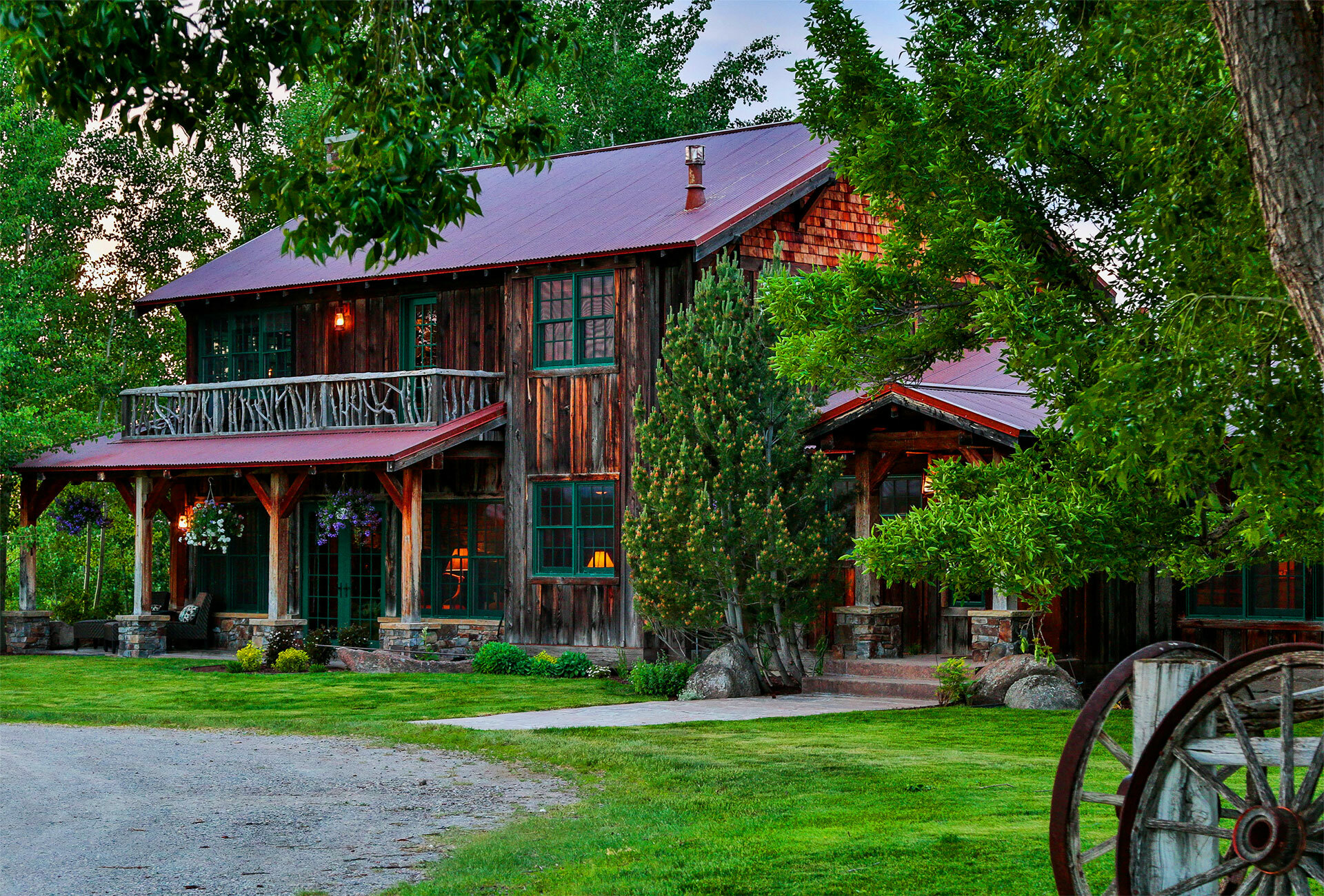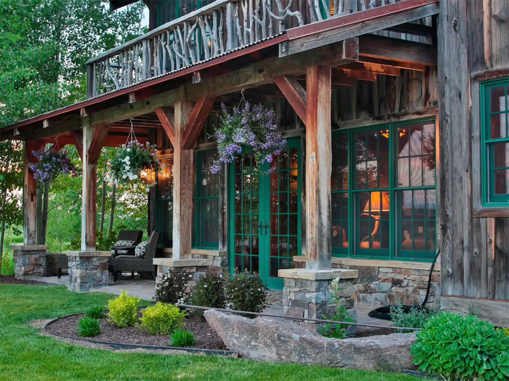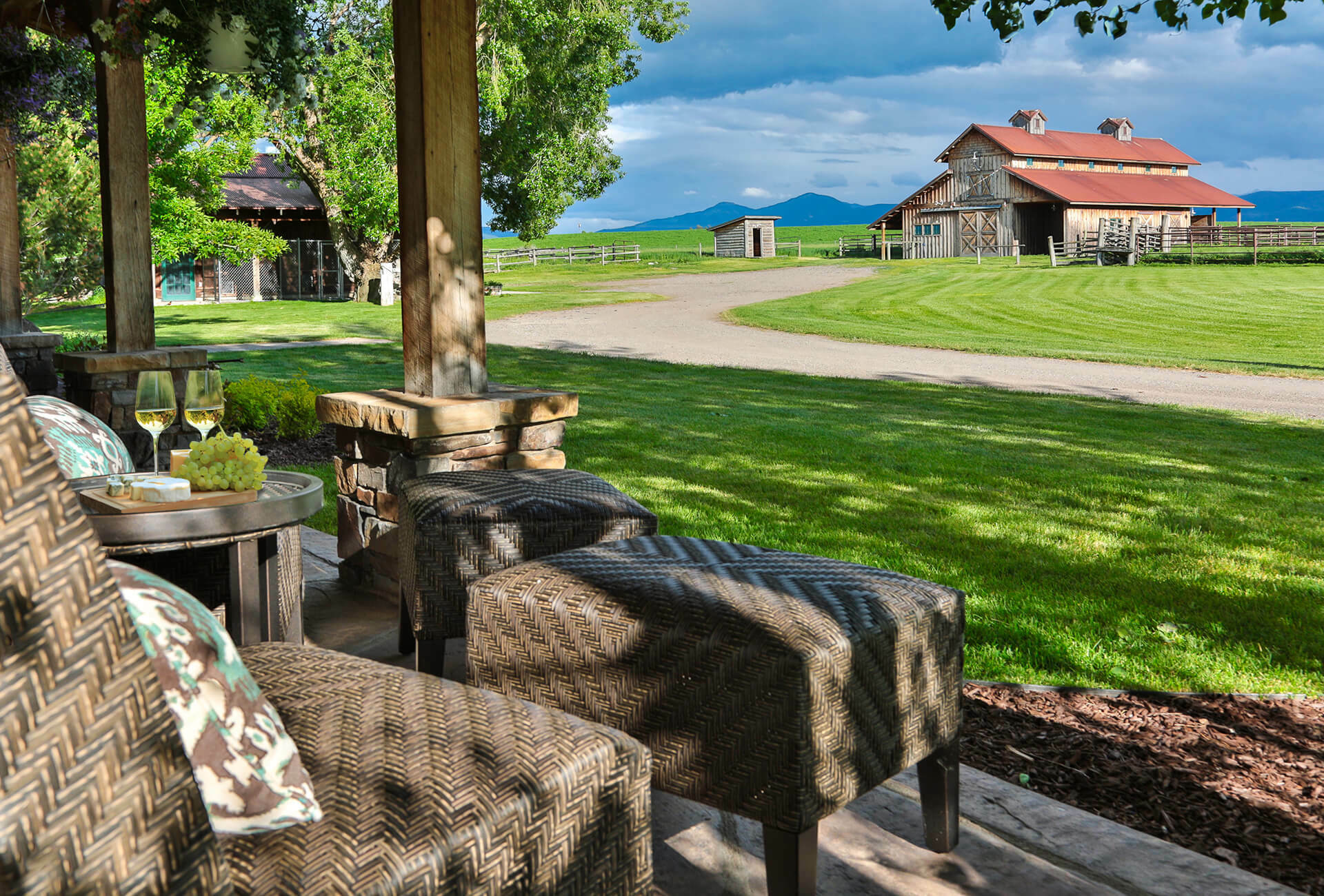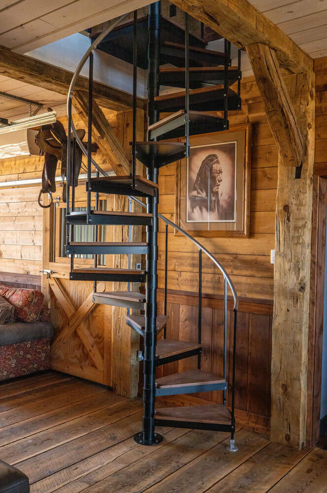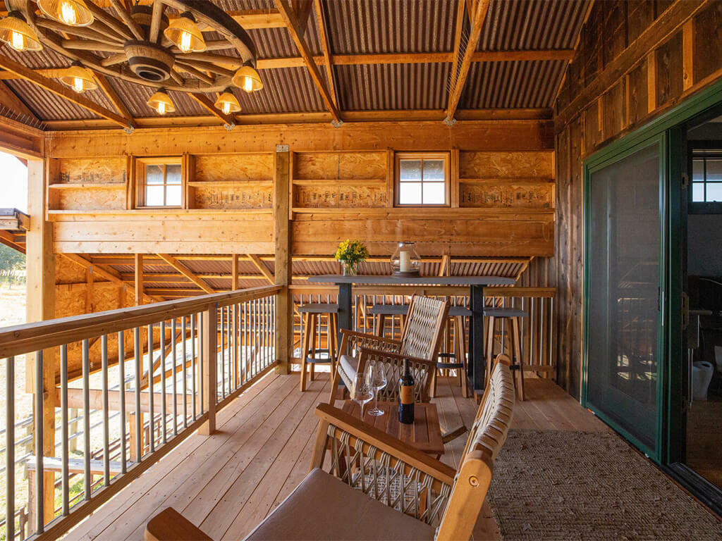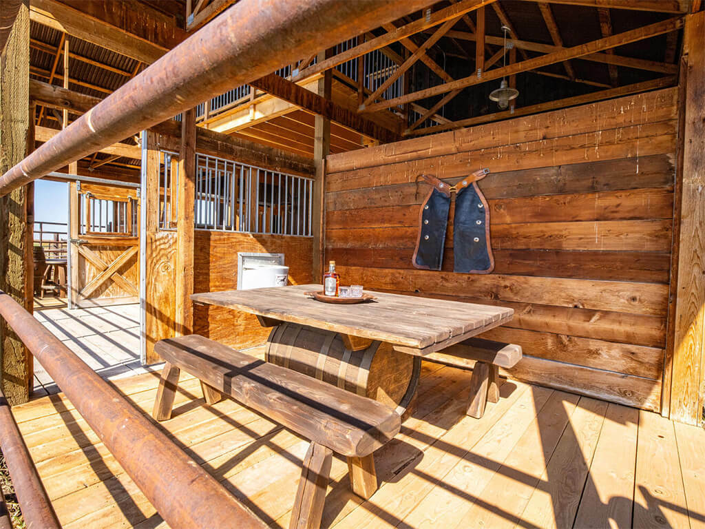 When you walk through the barn doors, you feel like you’ve stepped into the luxurious/adventurous west. Paintings and prints of local artists adorn the space, while a spiral staircase to the upper level takes you to the supple leather chairs, Direct TV, and a shuffleboard for entertainment. The allure of the modern west at our luxury barn is located just 10 minutes from Bozeman, MT. We added second level exterior seating space to the south just outside and under the back porch of the barn. Protected from the elements while experiencing the Montana outdoors, this space is where you touch life while embracing the comfort and security of the surroundings!